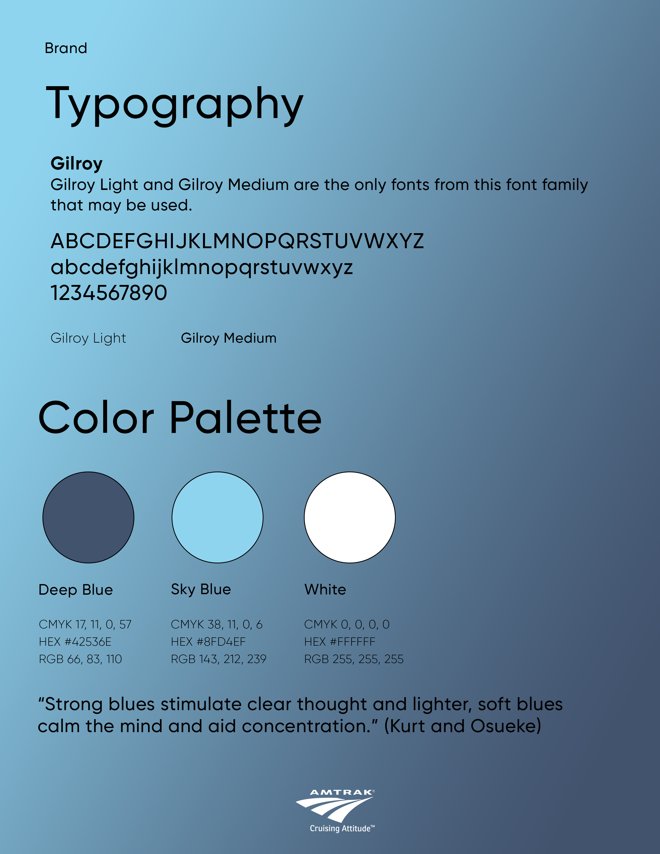 Finally, we revised Amtrak’s brand identity to help keep calm on the mind as these new changes get up and running. The use of blues was particularly important after research from Kurt and Osueke found that “blues stimulate clear thought.”