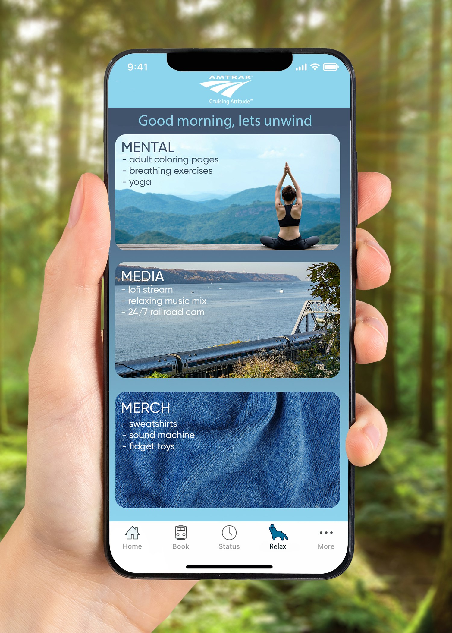 We paired our updated website with an revamped Amtrak app. All of our calming travel solutions are available as well as added wellness exercises such as beathing techniques and simple yoga poses that can be done from the comfort of your seat.